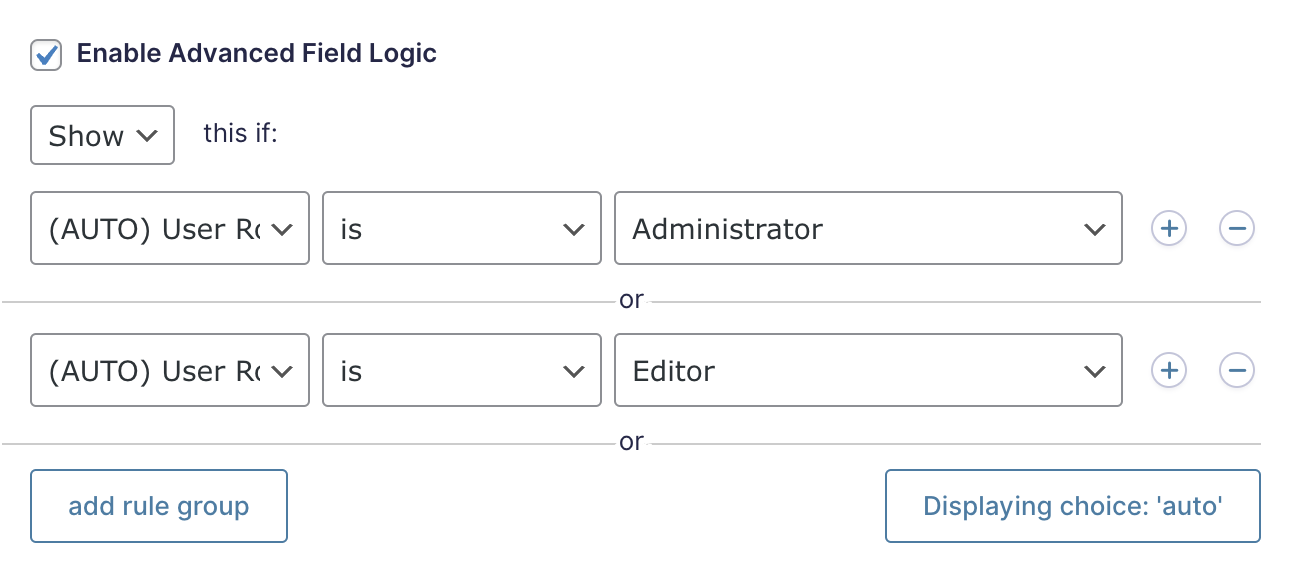 Add the hidden User Roles field to your form, and the options will show up in your conditional logic as if they were a standard checkbox field.After submitting a form, this plugin will calculate the conditional logic based on the actual role/s of the user on the backend rather than hidden submitted values. (This is the most secure way to check roles as it prevents spoofing) - To show/hide a field based on a the roles of the user viewing/editing the form (e.g. GravityView, GravityFlow, etc):Use the “(Current User Roles)” in the conditional logic of the form. Do not use this option unless you fully understand the difference between submitter and viewer. The rules you set with this option could potentially affect previously submitted fields if you apply them while editing an already submitted entry. (e.g. administrator editing an entry submitted by a customer)